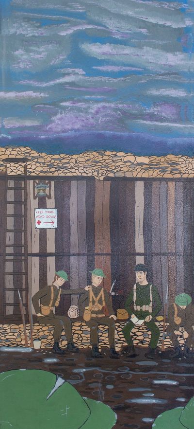 The sun has already set, and there’s an oil lamp lit. Smoke is rising above the helmet of a British Expeditionary Force soldier. This is a moment of leisure, of peace and quiet. The scene gives an inside view to the trenches of the war. Miriam-Webster defines “the trenches” as a place or situation in which people do very difficult work. Trenches are dirty, nasty places by nature because that’s where soldiers lived, slept, fought, and died. The artists created this panel to be interactive as well.