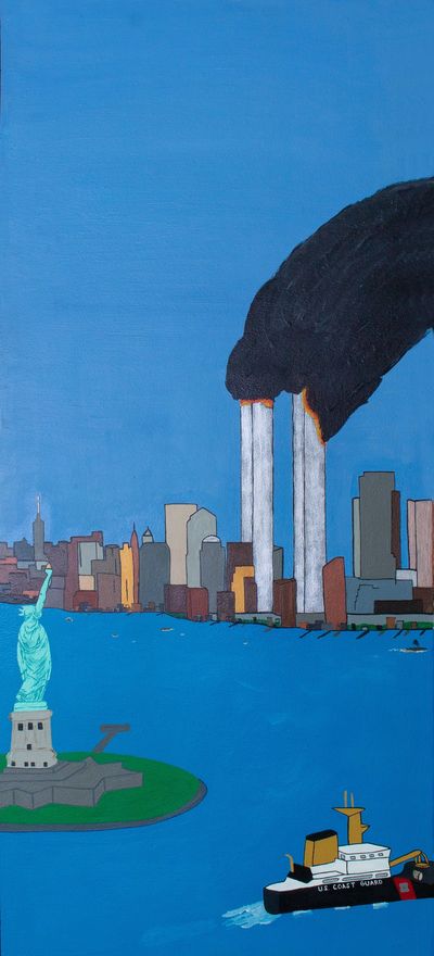 This view features the Statue of Liberty and the World Trade Center towers after being hit by American Airlines Flight 11 and United Airlines Flight 175. There is a stark contrast of the clear blue sky and the pronounced column of smoke. The smoke is also symbolic of the invasion of the dark unknown into the calm and peaceful world that didn’t know the long and drawn out war that would begin in the aftermath.