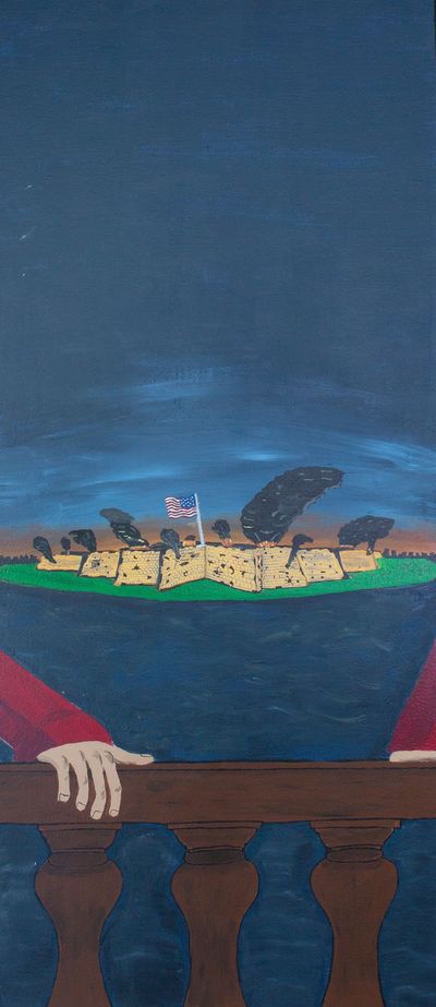 Initially, the artists were going to paint the sky red to depict “rockets’ red glare” but eventually decided against that. They thought it would be confusing and take away from the scene. They resolved to paint this panel to look like the dawn of a new day to incorporate the entire context of the National Anthem instead of the one line, rockets’ red glare.